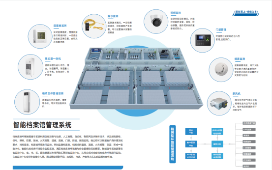 總而言之,檔案庫房內(nèi)溫度過高或過低,濕度太大或太小, 都會影響檔案材料的存放性。因此,必須對檔案庫房的溫濕度進(jìn)行控制與調(diào)節(jié),智能監(jiān)控系統(tǒng)的建立保障了檔案材料的質(zhì)量,同時又優(yōu)化了人員的維護和工作效率、降低能源消耗,又節(jié)約了運行成本,最大限度地延長檔案的壽命。