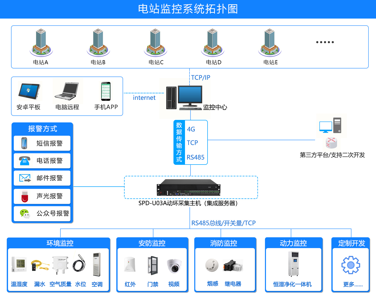 所要求的的解決方案應(yīng)接入電站的動(dòng)力環(huán)境監(jiān)測系統(tǒng),電腦軟件監(jiān)控,選配APP、電話、微信、小程序、現(xiàn)場聲光、短信語音等告警方式。在多個(gè)分布在不同需要檢測漏水的區(qū)域中,可通過 485 布線的方式連接至動(dòng)力環(huán)境監(jiān)控主機(jī),將數(shù)據(jù)傳輸至環(huán)境監(jiān)控平臺,在監(jiān)控的區(qū)域內(nèi)出現(xiàn)漏水狀況,系統(tǒng)會(huì)將漏水的信息通過所選定的告警方式來通知管理人員,以便管理人員及時(shí)作出處理,從而避免一些意外事故的出現(xiàn)。