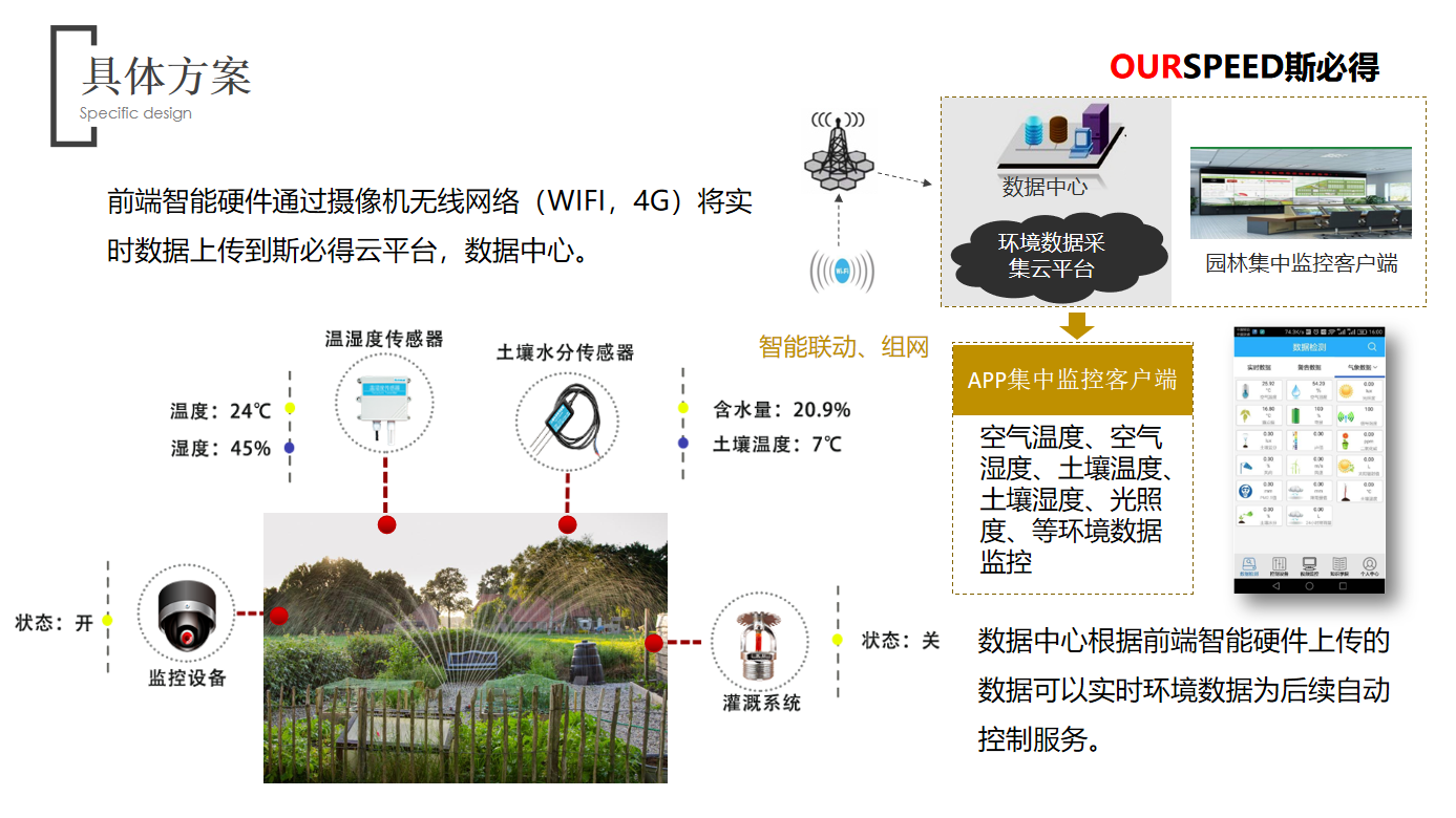 園林環(huán)境及墑情監(jiān)測優(yōu)勢:實現(xiàn)管理人員對園林各個區(qū)域的環(huán)境溫度、濕度、風(fēng)速、光照、土壤水分等參數(shù)進行監(jiān)測;對園林綠化業(yè)務(wù)全流程進行精細化管理,對環(huán)境變化可進行認為干預(yù),減少植物折損率;對園林噴灌用水量進行監(jiān)控,為水資源利用提供有效的數(shù)據(jù)分析支持;根據(jù)土壤墑情及環(huán)境參數(shù)現(xiàn)狀建立用水量及灌溉方法數(shù)學(xué)模型。