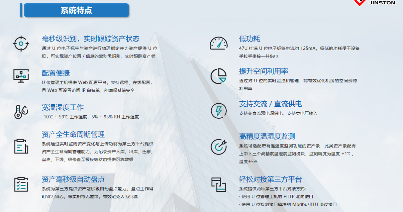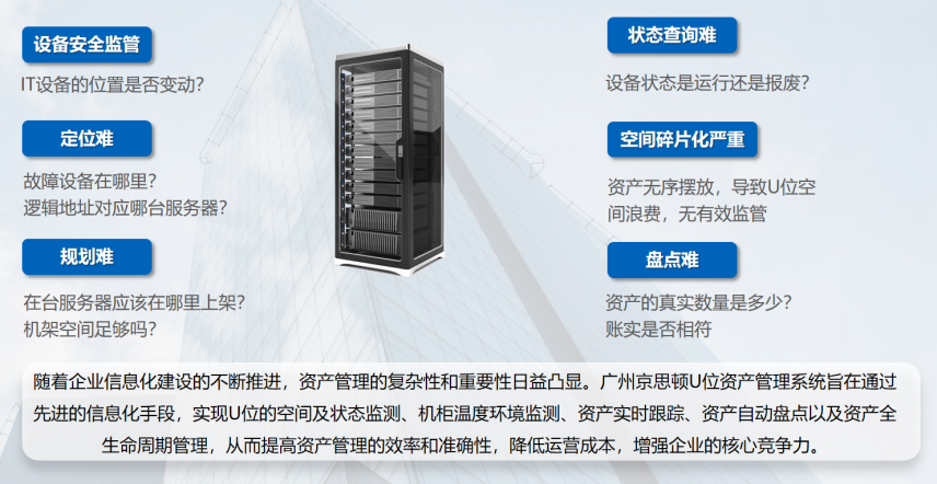 廣州斯必得U位資產(chǎn)管理系統(tǒng)通過先進的技術(shù)手段和管理理念,實現(xiàn)了對U位空間和狀態(tài)、機柜溫度環(huán)境、資產(chǎn)實時跟蹤、自動盤點以及全生命周期的全面管理。該系統(tǒng)的實施將有效提升企業(yè)的資產(chǎn)管理水平,降低運營成本,增強企業(yè)的競爭力。